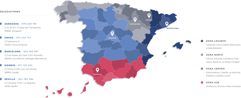 Tras más de 25 años, contamos con delegaciones en Barcelona, Huesca, Madrid, Sevilla y Zaragoza, ofreciendo nuestros servicios a más de 30 provincias, tanto en la península como en las islas.